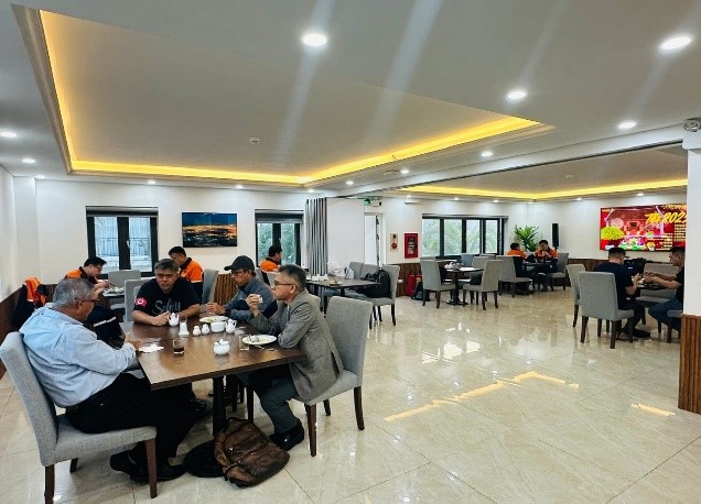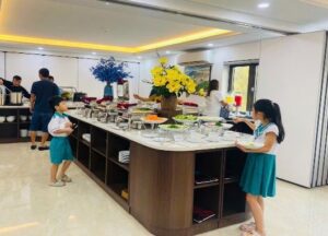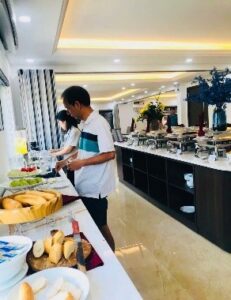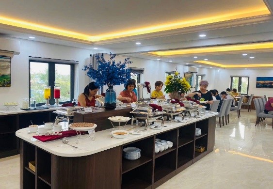 Khách sạn phục vụ ăn sáng buffet với món ăn đa dạng, phong phú , bao gồm các khu vực đồ ăn nóng , chế biến tại quầy, các món salad, quầy bánh mì bơ mứt, quầy trà, café, sữa tươi, nước trái cây theo mùa